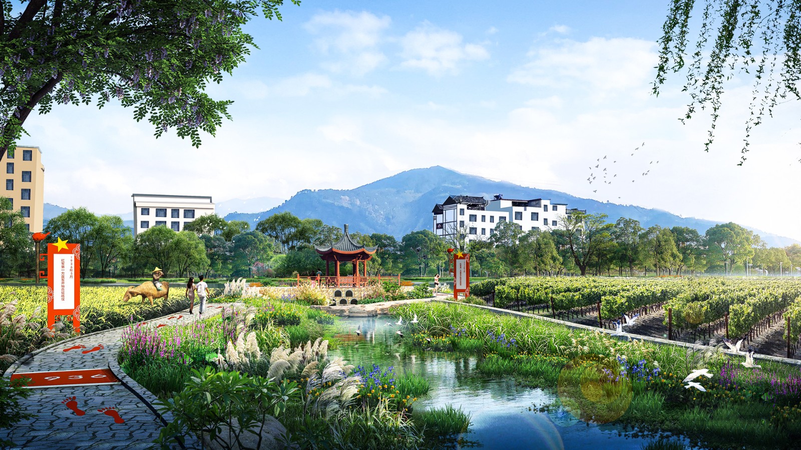 项目定位“一址一村”,以“实事求是鱼水情谊”为主题,长征过中峰为历史背景,通过长征旧址遗迹(粟传谅故居、红军井、龙溪庵堂、粟氏宗祠、红军岩)与自然景观(资江美景),结合现代农业(龙溪葡萄、红提种植产业)串联形成集红色文化传承,休闲观光于一体的新“长征路”。